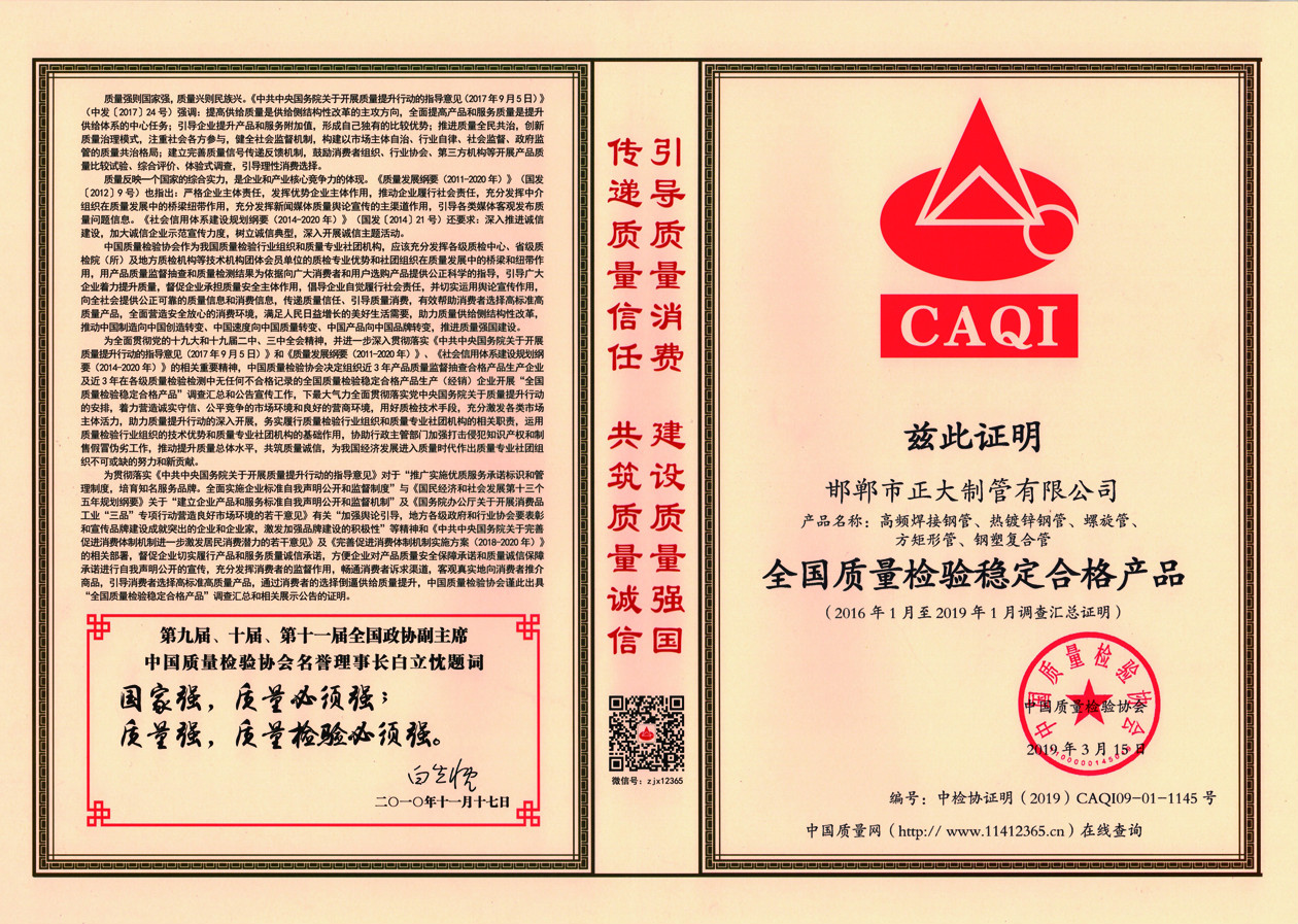 2019年“3.15”國(guó)際消費(fèi)者權(quán)益日,正大制管在中國(guó)質(zhì)量檢驗(yàn)協(xié)會(huì)的組織下開展了以“堅(jiān)持質(zhì)量第一,堅(jiān)守質(zhì)量誠(chéng)信;抓好質(zhì)量提升,建設(shè)質(zhì)量強(qiáng)國(guó)”為主題的“產(chǎn)品和服務(wù)質(zhì)量誠(chéng)信承諾”主題活動(dòng)。榮獲“全國(guó)質(zhì)量檢驗(yàn)穩(wěn)定合格產(chǎn)品”和“全國(guó)產(chǎn)品和服務(wù)質(zhì)量誠(chéng)信示范企業(yè)”兩項(xiàng)榮譽(yù)。
